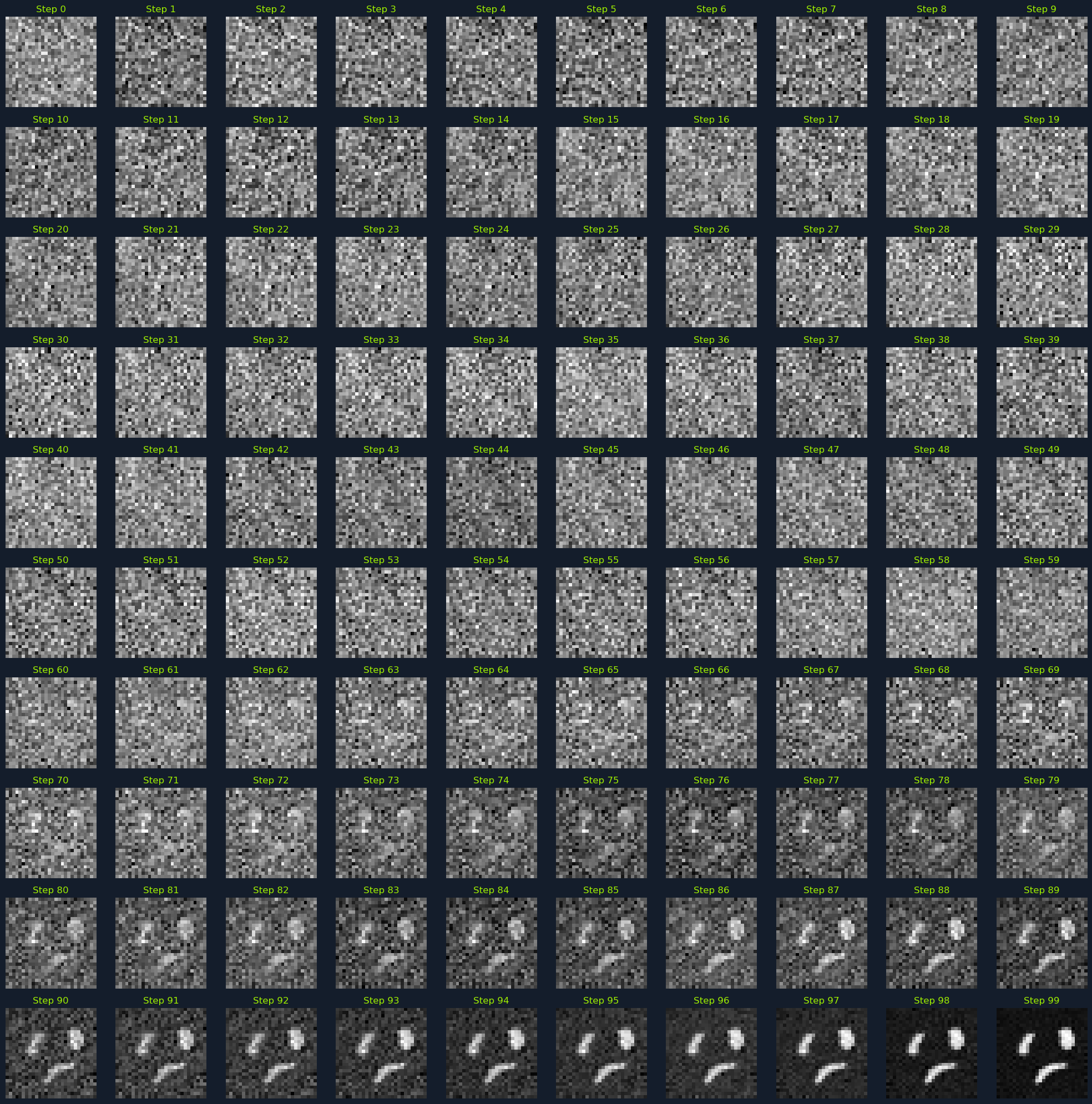 Once the model is trained, you can generate new images by sampling from the learned distribution. This involves starting with pure noise and iteratively applying the reverse process to remove the noise: