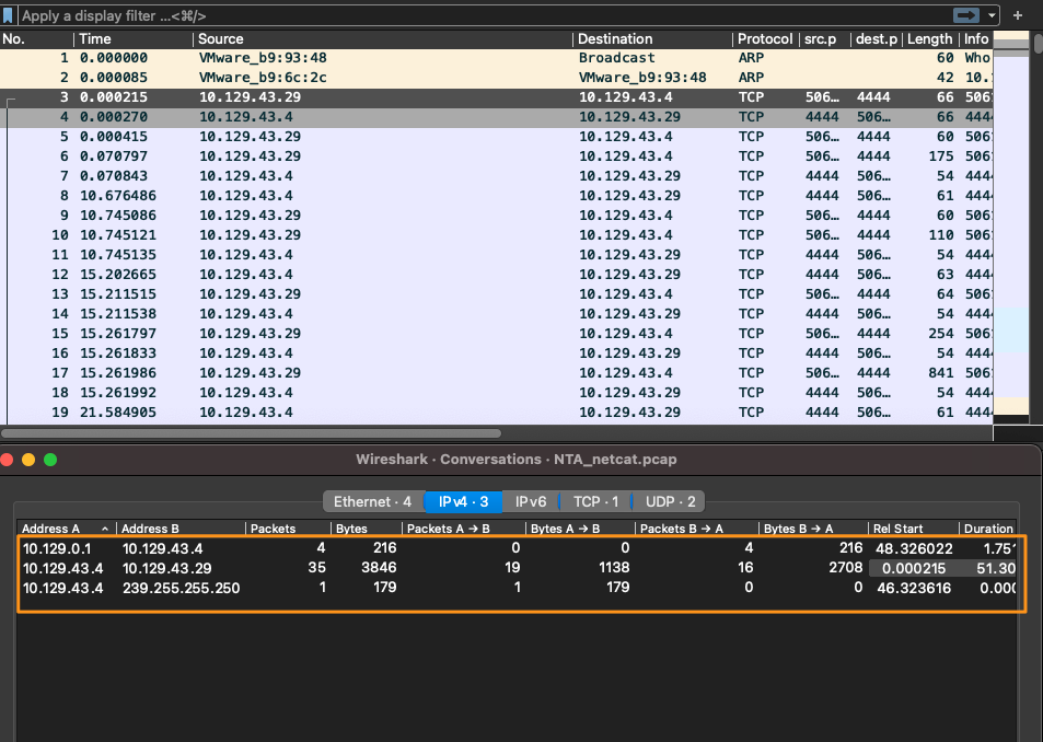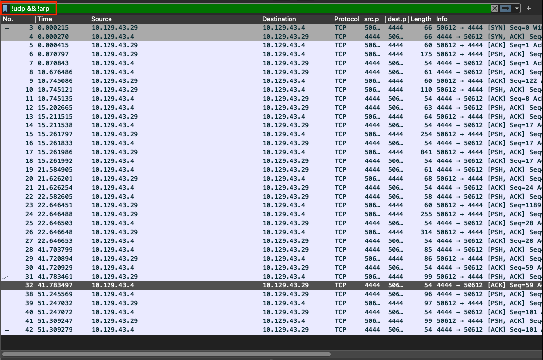 Now that we have cleared our view a bit, we can see the remaining packets are all TCP, and all appear to be the same conversation between hosts 10.129.43.4 and 10.129.43.29. We can determine this since we can see the session establishment via a three-way handshake at packet 3, and the same ports are used through the rest of the packets in the output below.