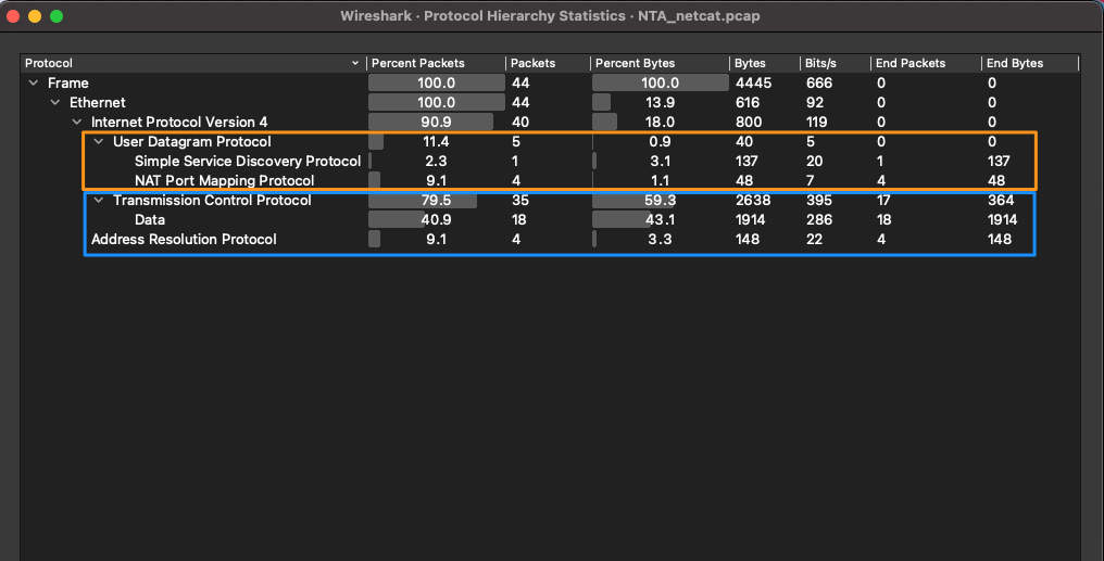 When filtering on just UDP traffic, we only see nine packets. Four arp packets, four Network Address Translation NAT, and one Simple Sevice Discovery Protocol SSDP packet. We can determine based on their packet types and information they contain that this traffic is normal network traffic and nothing to be concerned about.