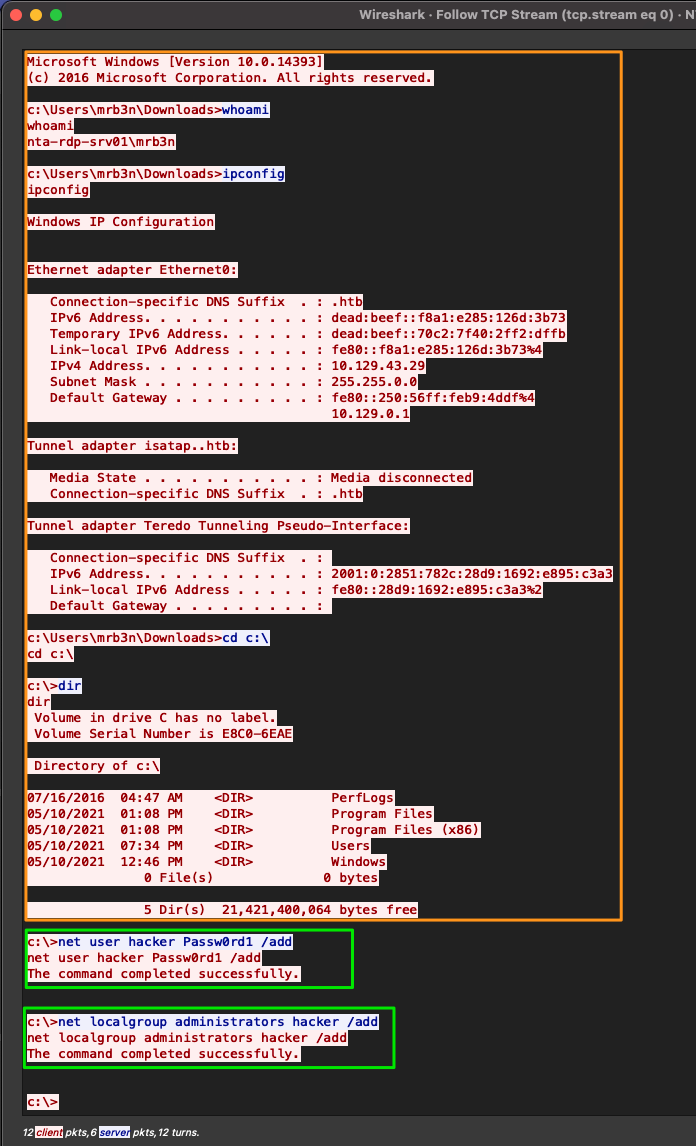 Now that we followed the TCP stream, we should have alarm bells ringing for us. We can see this entire conversation between the two hosts in plain text, and it appears that someone was performing several different actions on the host.